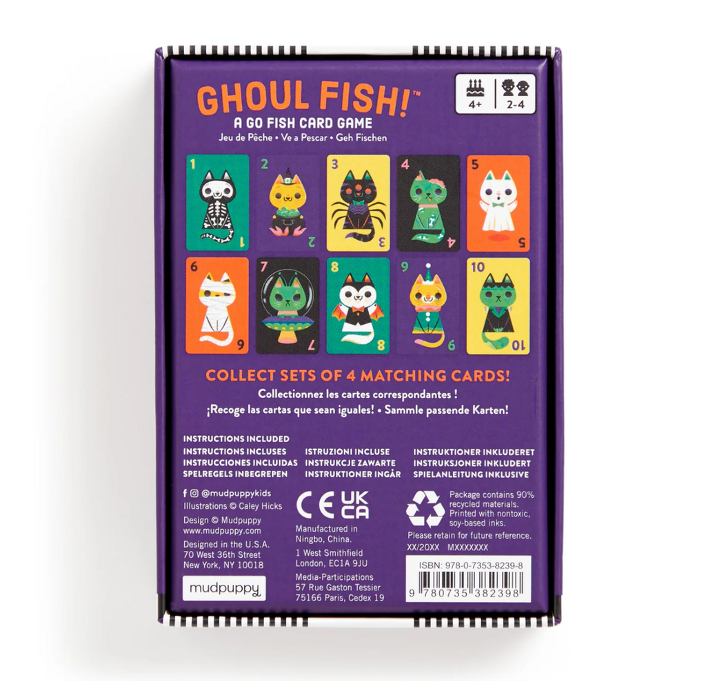 Ghoul Fish! from Mudpuppy is a spooky spin on the classic game of Go Fish. Collect the most sets of 4 matching cats to win a purr-fect game for Halloween boo baskets!