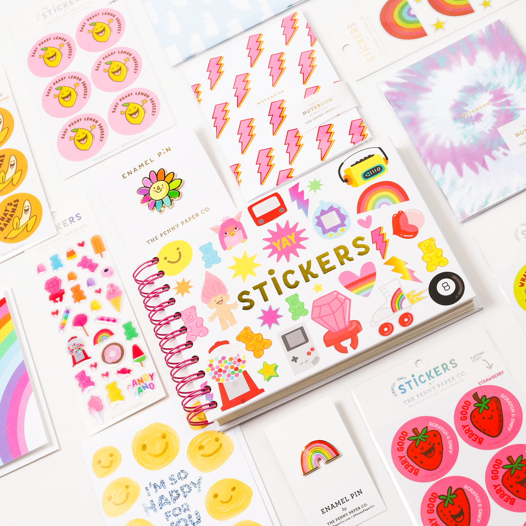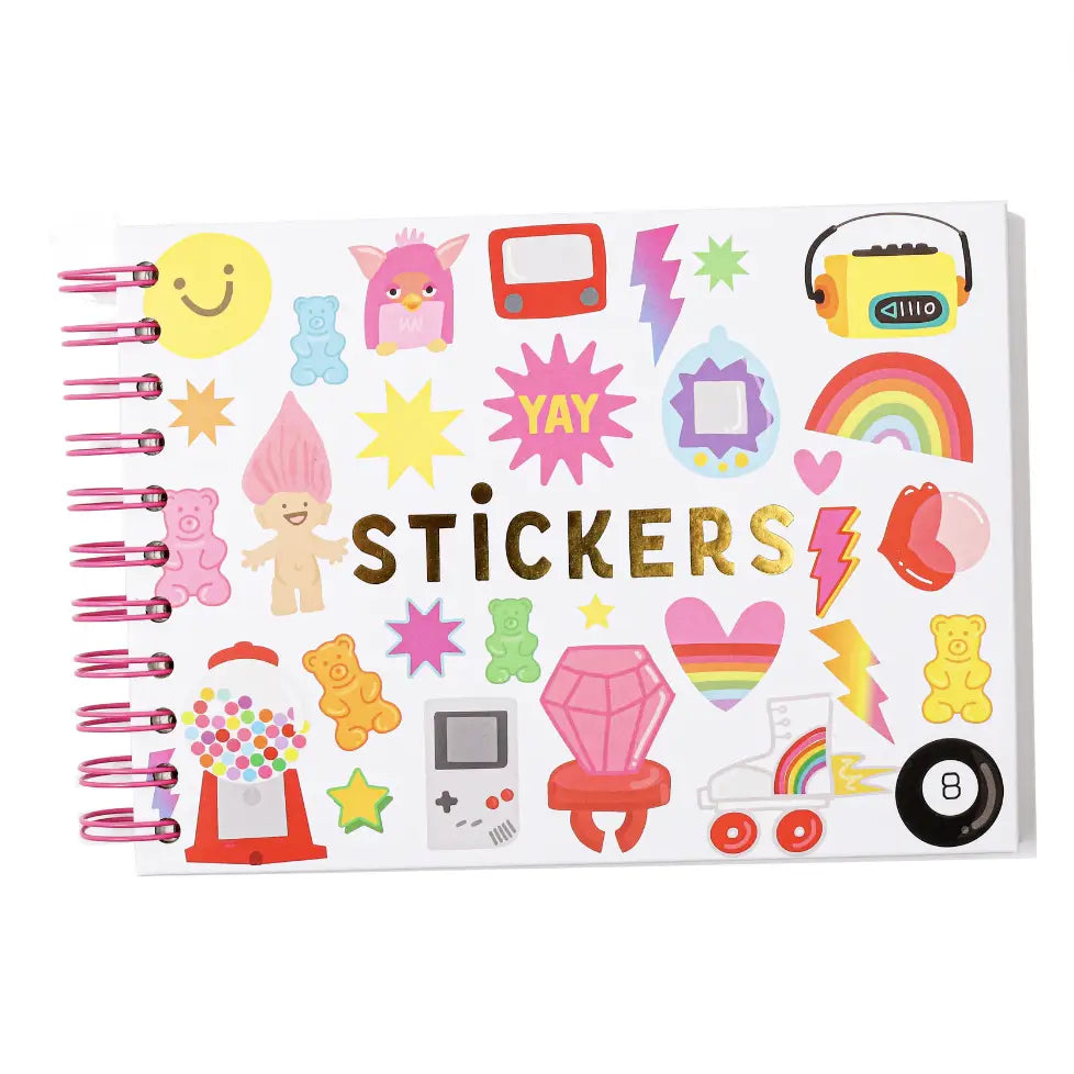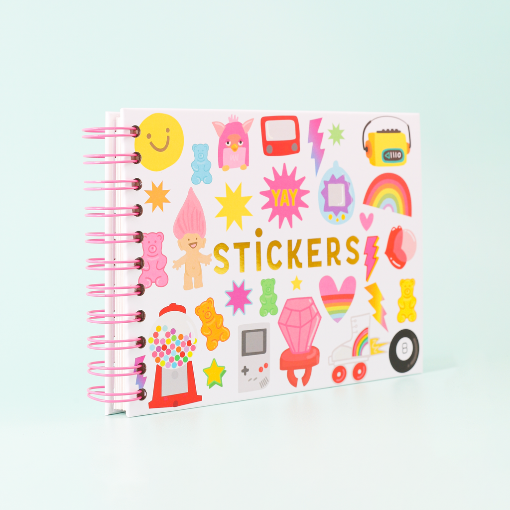 We can't decide if it's a Crazy 80's or 90's sticker book cover, we'll let you decide. What we do know is that we are obsessed with all of the retro toys we drew for the cover and it brings back all the feels. - 40 Peel Back Pages - Hardcover - Pink Coil Bound